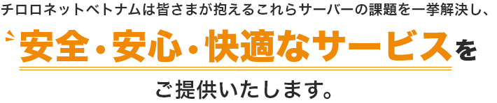 Webサイト上にある数あるサーバーから、どれが合うのか、ちゃんと移行ができるのか、不安を抱えながら申し込み。難しいマニュアルを片手にサーバーと長時間格闘。そんな経験ありませんか?チロロネットはサーバーをご契約いただく前に、少なくとも一度は顔を合わせてご要望をヒアリングさせていただいています。ベトナム全土、お伺いいたしますのでお気軽にお声がけください。